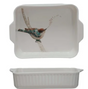 This 9-inch long, 2-inch high stoneware baker, adorned with a serene bird motif, brings a touch of the wild to any culinary creations. With a one-quart capacity, it's perfectly sized for varied dishes, from hearty casseroles to sweet cobblers. The baker's rectangular form is complemented by two sturdy handles for easy carrying, while its multi-colored glaze adds a vibrant flair to any table setting. Designed to fit seamlessly into farmhouse, French country, forest, or transitional decor, it's a versatile piece that celebrates both the beauty of nature and the joy of baking.