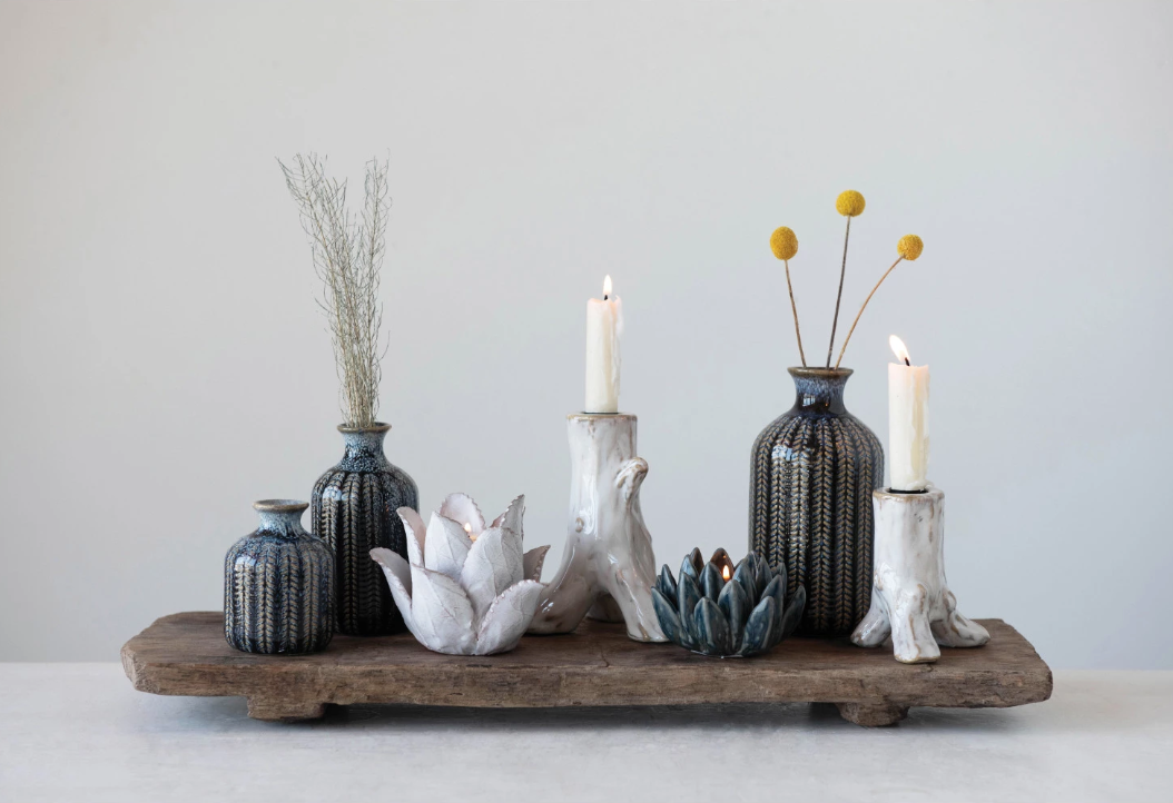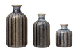This elegant trio of stoneware vases features an interesting striped pattern. Their varying heights create a splendid setting when they are lined up next to each other. To accent a shelving unit, place each on a different level with one on the right, one on the left and one in the middle.