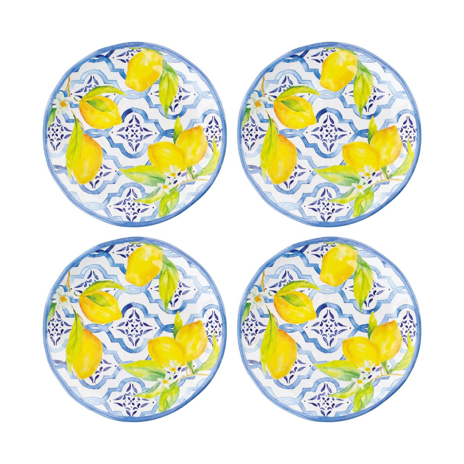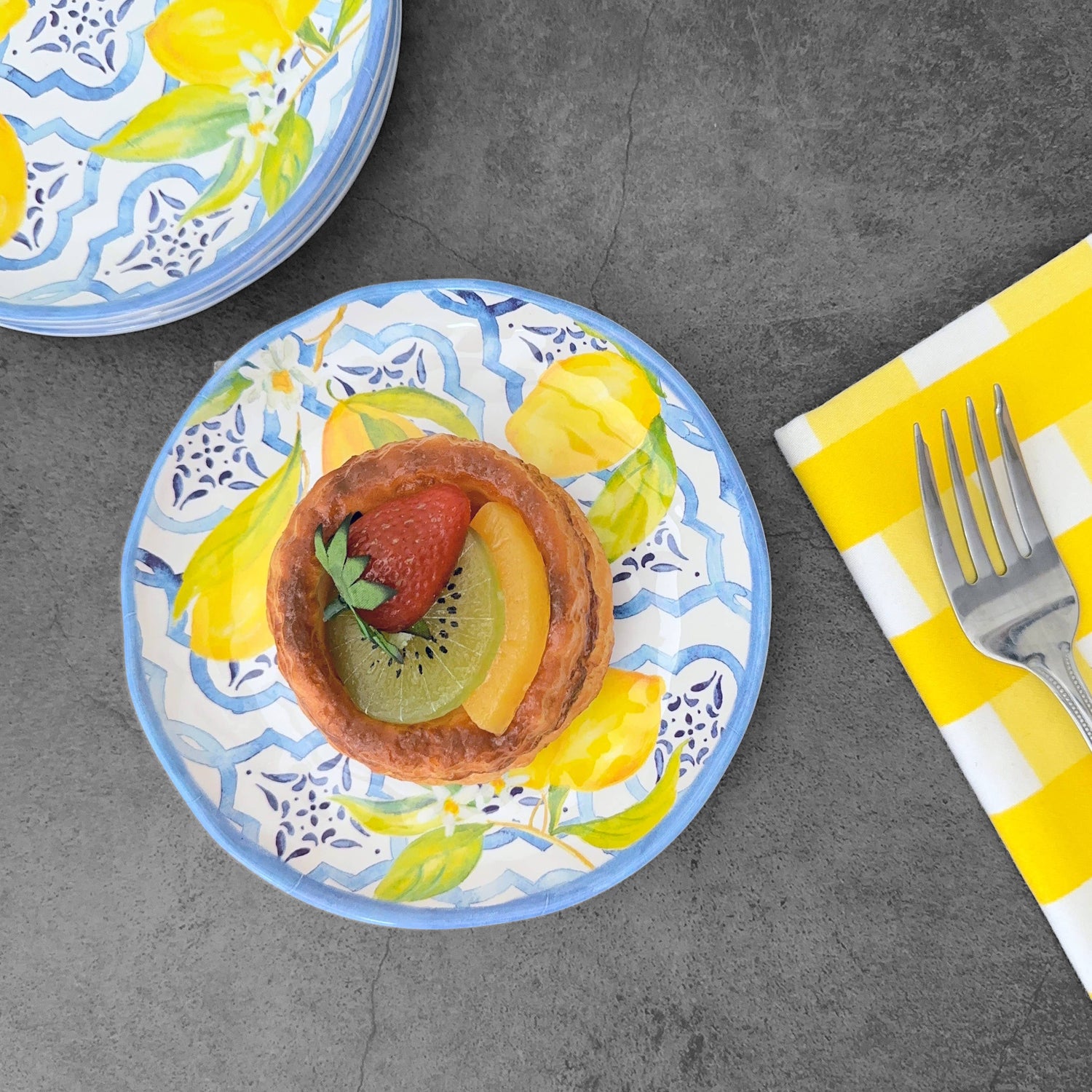Assorted, sold as individual pieces, the price is per plate. Set a gorgeous dinner table with lovely lemons print pieces that coordinate perfectly. These lovely lemons melamine dinnerware set are attractive, functional and a welcome addition to any indoor or outdoor table. It's shatterproof and food safe properties, perfect for entertaining, use it daily to add a bit of joy to your everyday. Easy to clean and dishwasher safe. Size: 6" dia. x 3/4" H Material: 100% Melamine Care & Clean: Dishwasher Safe. Do not use in microwave. Includes: 1-PC