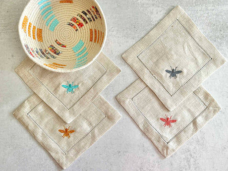Embroidered Bee Linen Coasters, set of four