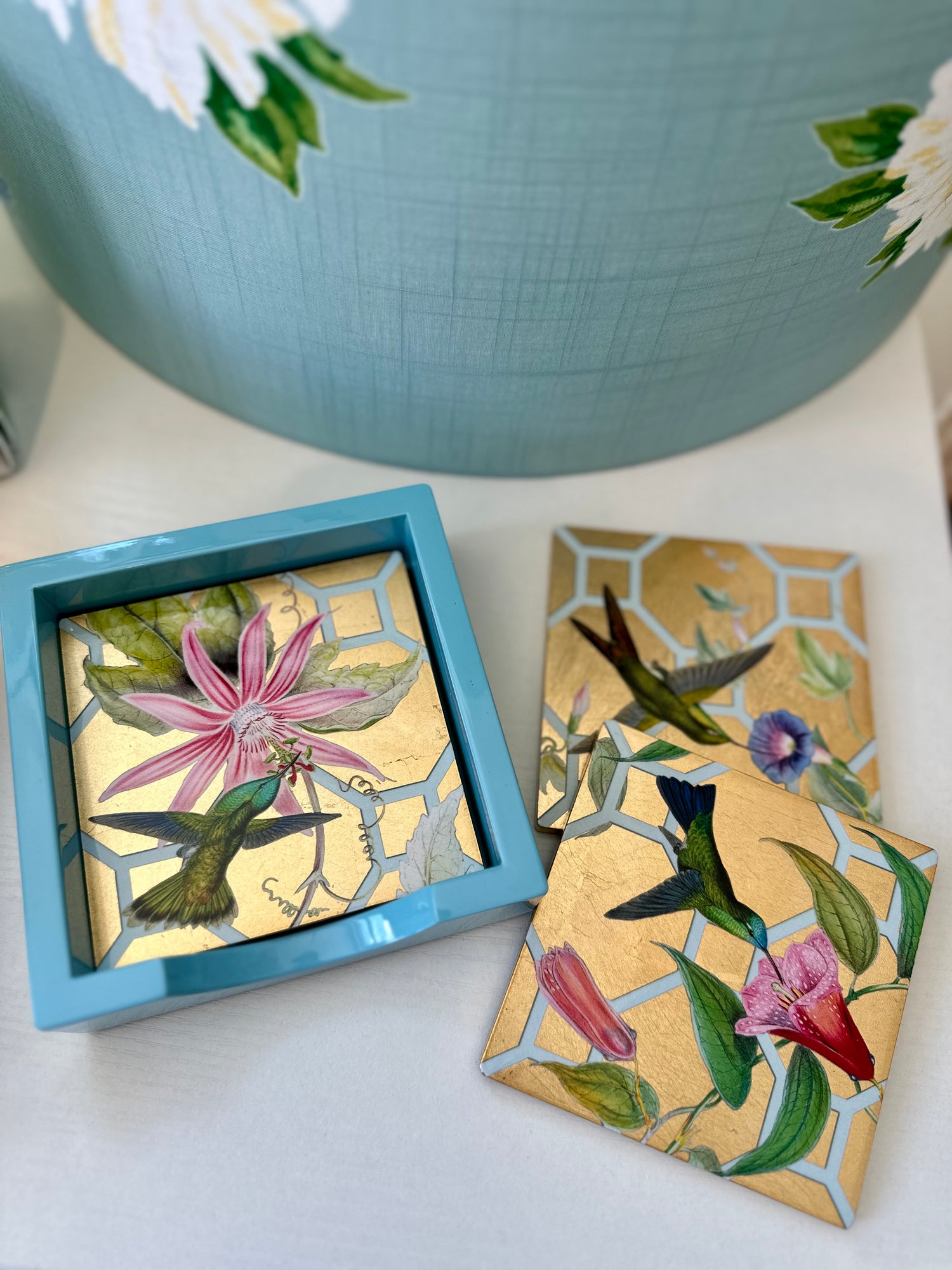 Add a touch of nature to your home decor with our Humming Bird Coaster Set. Made from durable lettuce material, each coaster features a beautiful hummingbird design in eye-catching turquoise. Protect your furniture while adding a touch of beauty to your space.