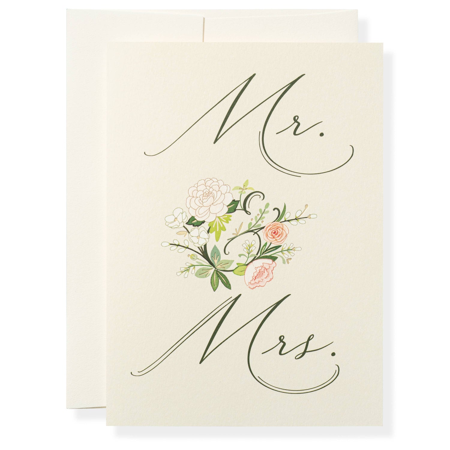 Our Mr. & Mrs. greeting card is printed and foiled in Memphis, TN. Full color ink printed on natural white paper, letterpress printed in gold foil, and paired with a natural white envelope. Book folded card, blank on the inside.
