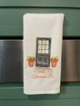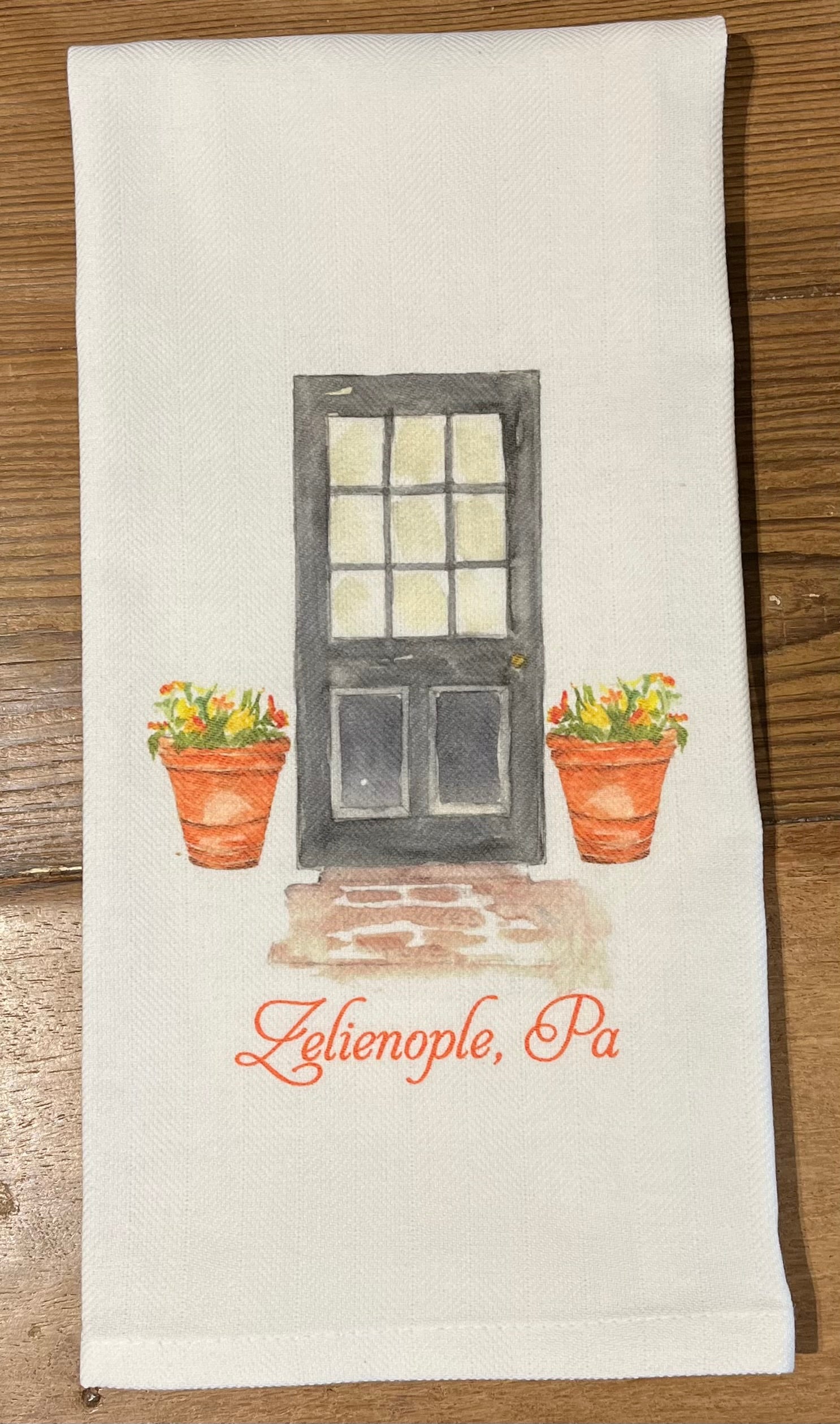Introducing the Zelienople Door Tea Towel - a whimsical way to add a touch of small town Zelienople to any kitchen. This tea towel features a charming front door design with flower pots, perfect for adding a quirky touch to your home.