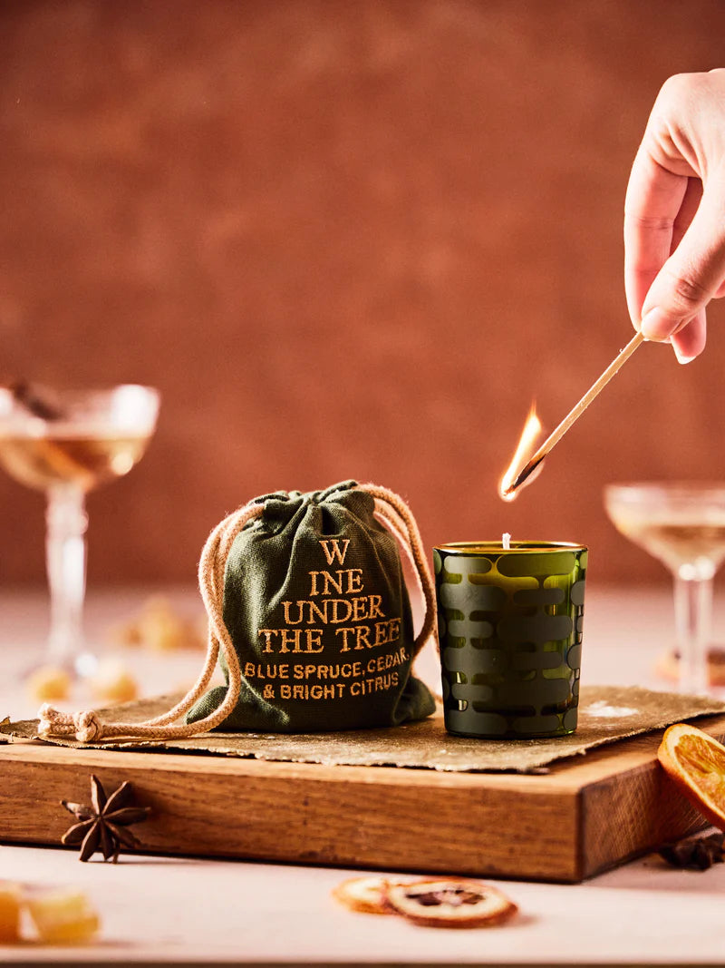 Grab your favorite glass of red and reminisce on warm holiday memories under a freshly cut tree. Notes of cool blue spruce and bright citrus illuminate the season, while woody cedar brings peace to snowy evenings. Our 2.5oz candle comes in an embroidered bag.